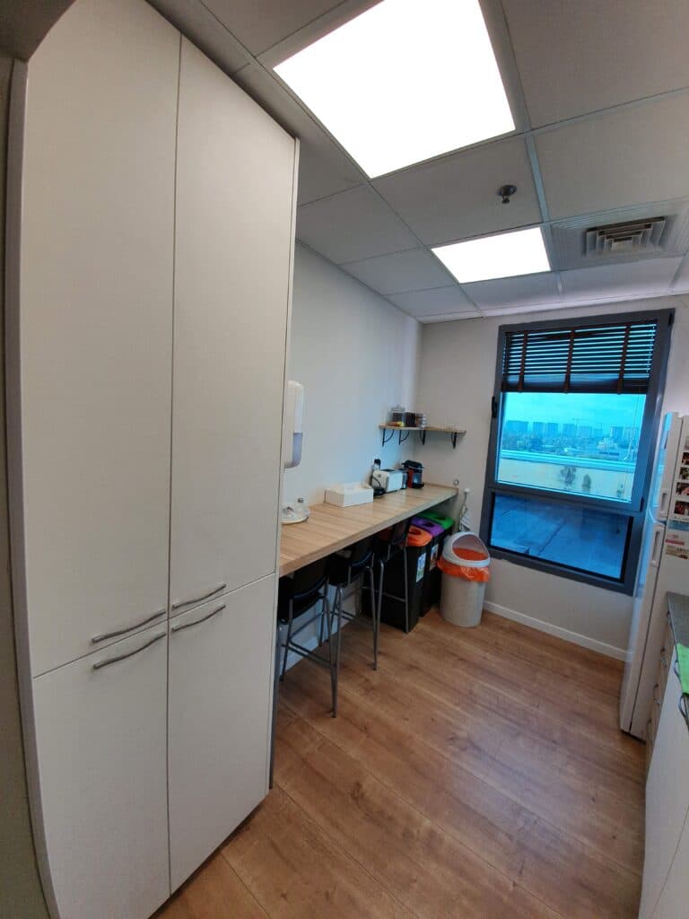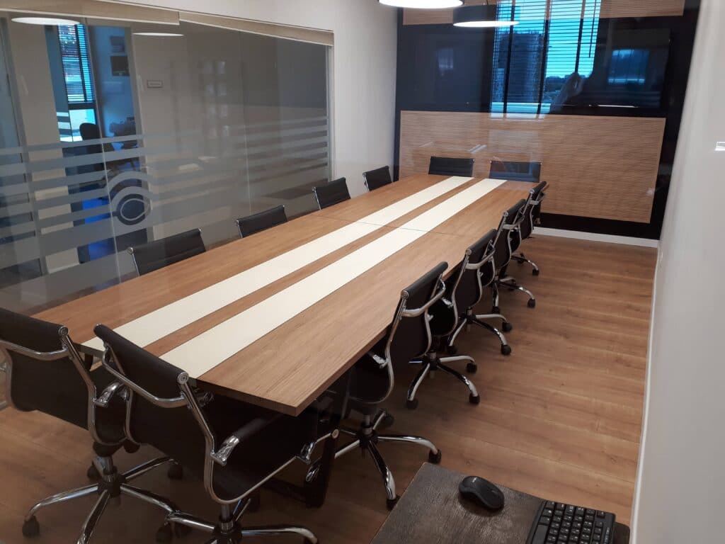 חלל הישיבות היה מאתגר במיוחד הלקוח רצה שולחן מפנק באורך 4.5 מטר לאחר סקיצות והתייעצויות לגבי העיצוב הנבחר הגענו לתואה המיוחדת של פסי פורמייקה שמודבקים בעבודת אומן זה לצד זה ויוצרים עיצוב מיוחד ושונה שלא משאיר מקום לספק שהרהיט הוא בהתאמה אישית.