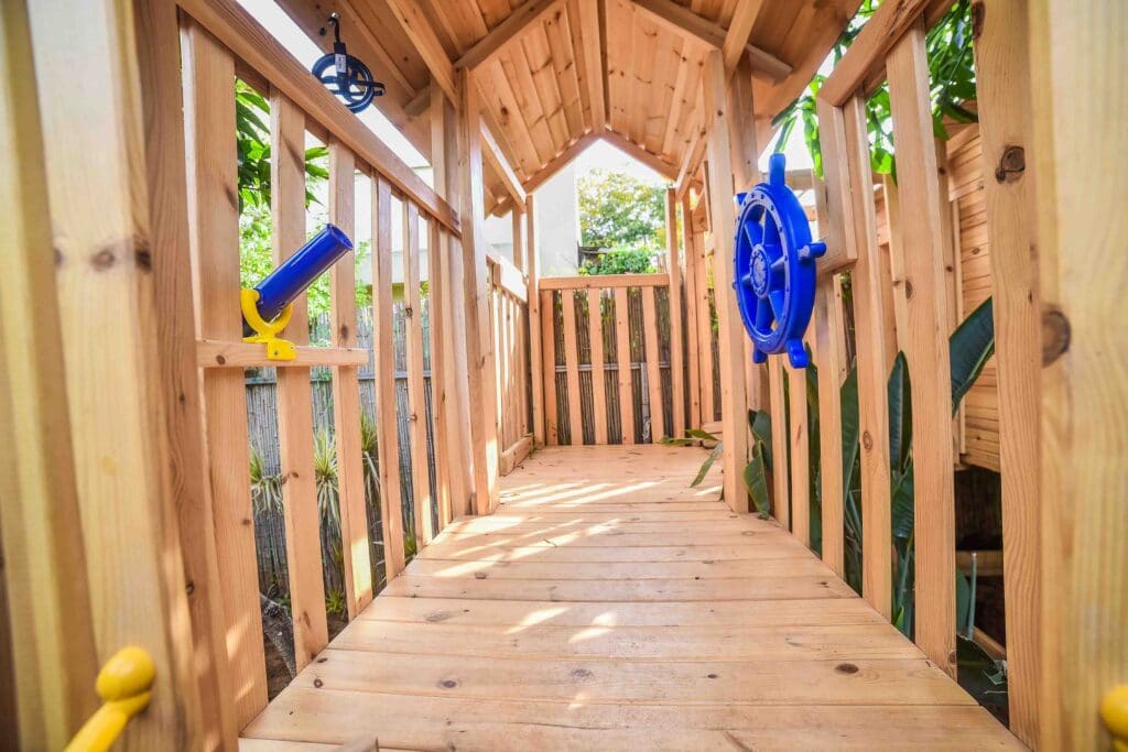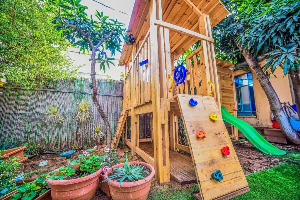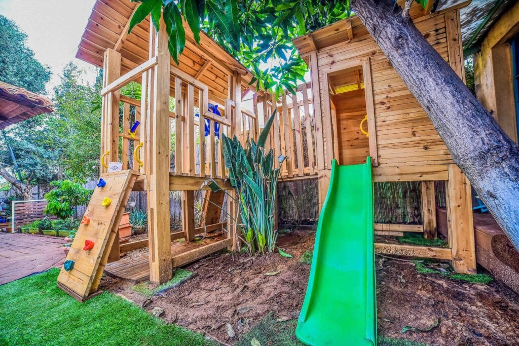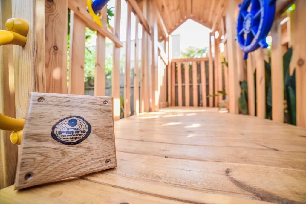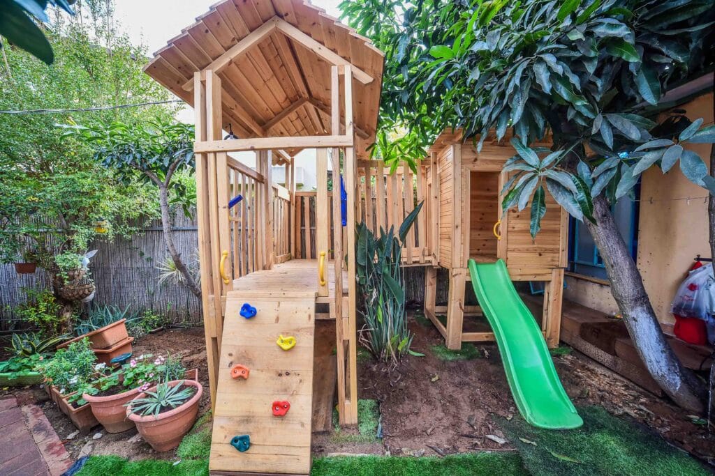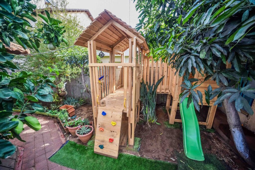 ביחד עם בעלי המקום הבנו את העיצוב שהם מדמיינים והחלנו במלאכת הבנייה, המתקן עצמו נבנה בעץ אורן וכולל בתוכו גשר מעבר, מגלשה לילדים, קיר טיפוס קטן ובית קטן לחפש בו מלמעלה ומלמטה, תוספת מיוחדת לגן מיוחד במינו.