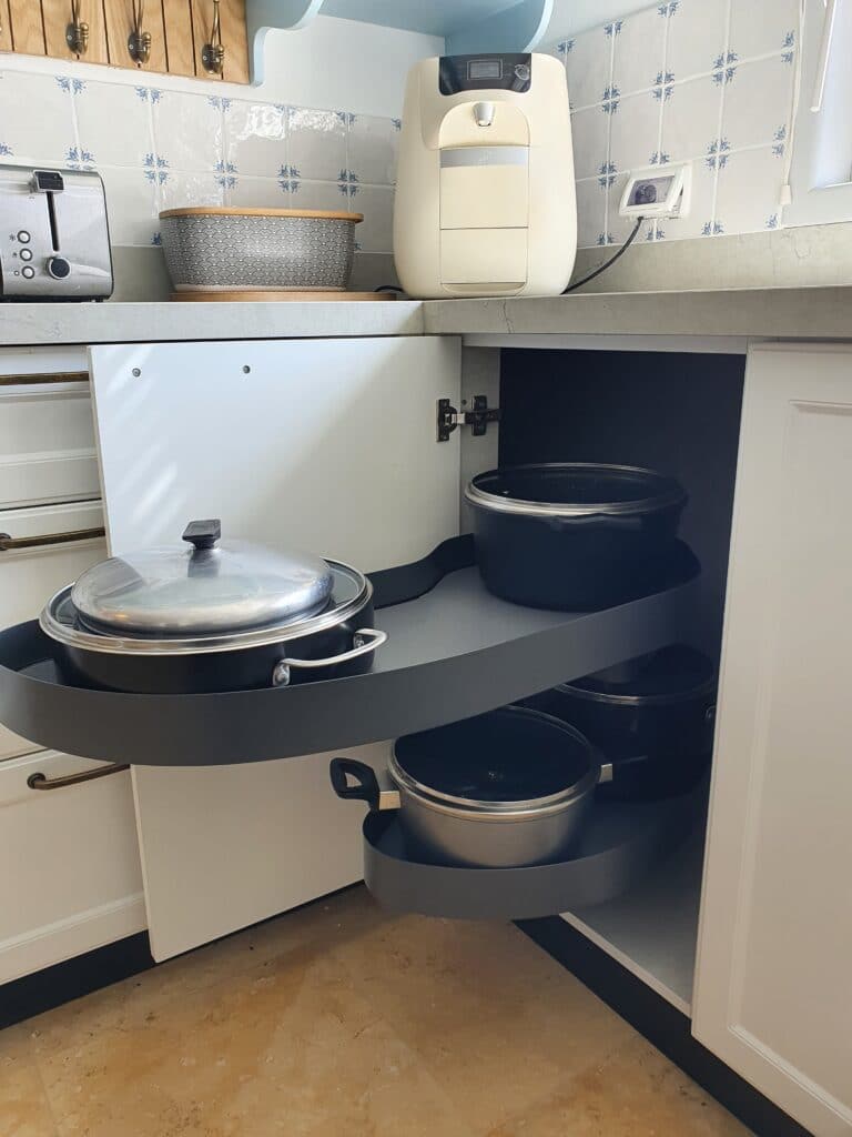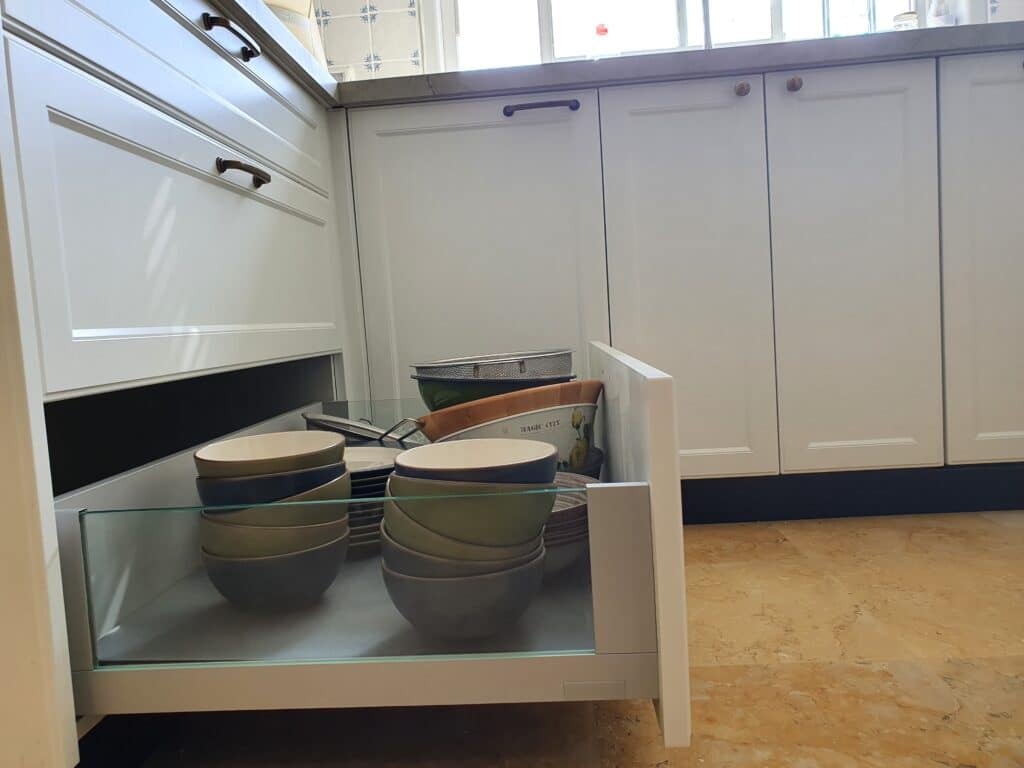 בחרנו בחזיתות דגם אינגלנד מדורג של חברת Porta-Line בשילוב מגירות לגראבוקס דופן זכוכית.