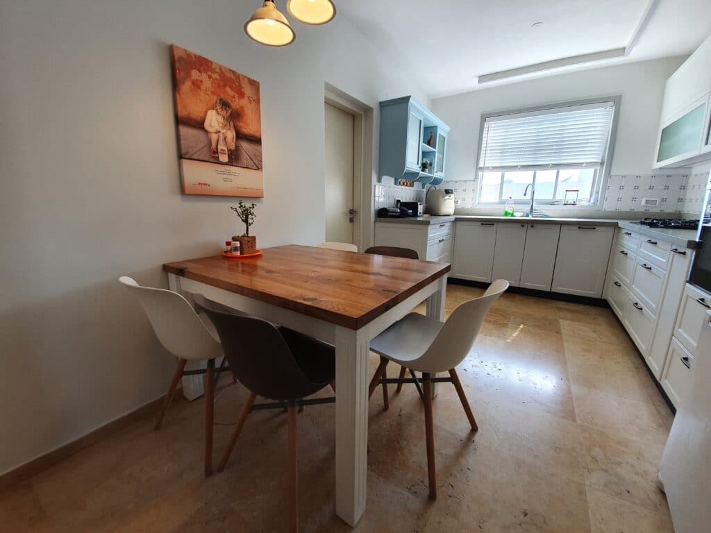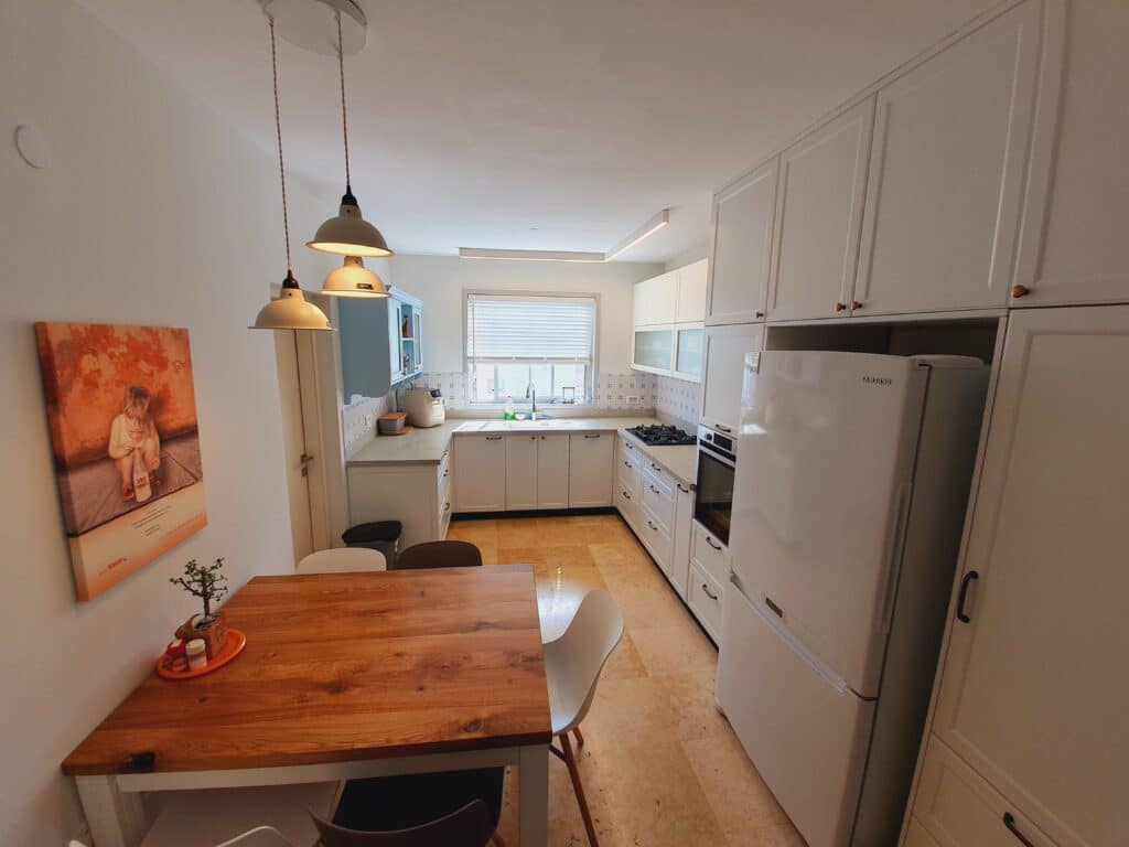 את הנישה שלחנו לצבעי המוכשר על מנת לתת טאץ שונה למטבח ניצלנו את החלל והוספנו שולחן מיוחד מעץ מלא אשר נתן מענה לאופציית הישיבה מכיוון שהלקוחות לא רצו אי ייצרנו את השולחן בהתאמה אישית.