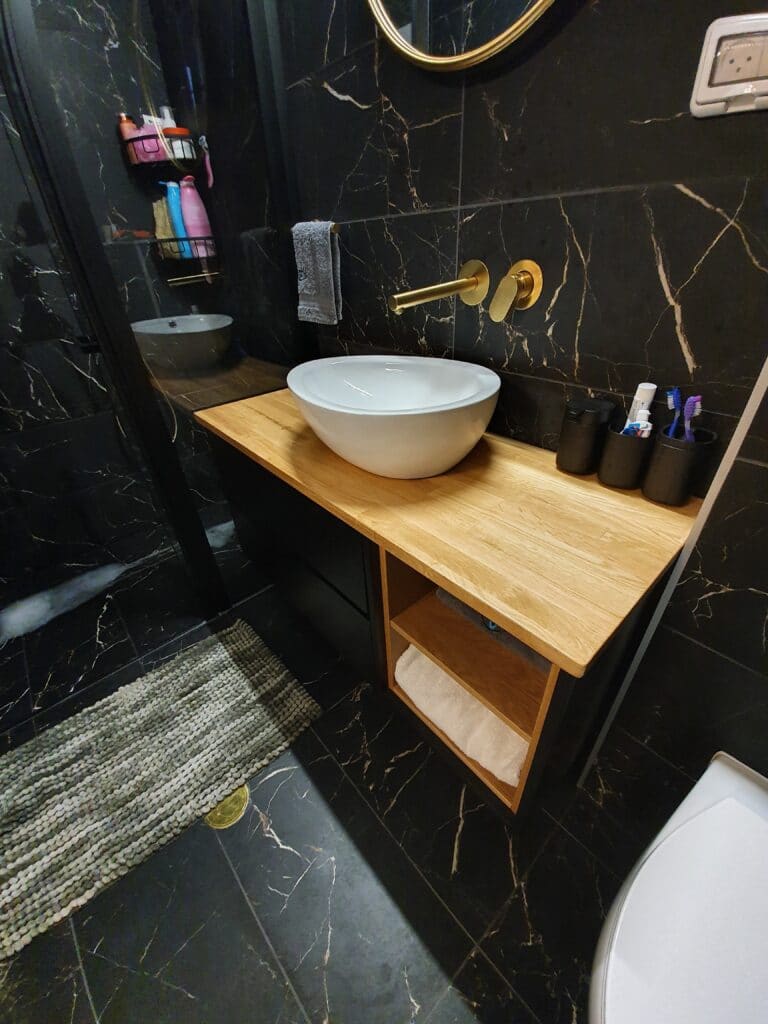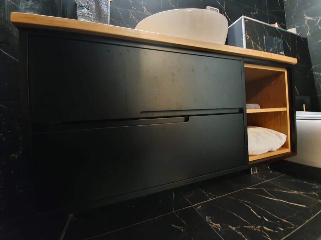 ארון אמבטיה צבע בתנור שחור בשילוב בוצר אלון מבוקע