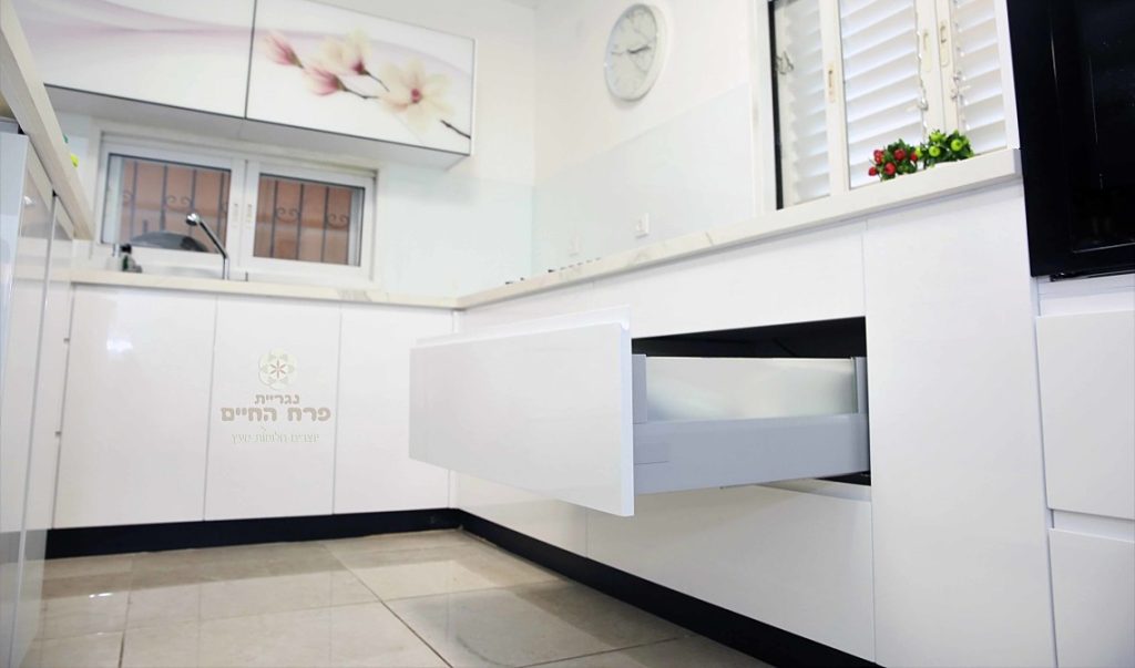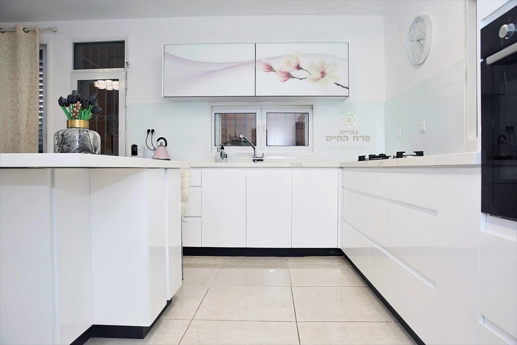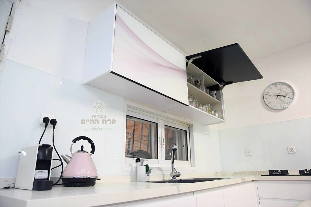 הלקפה הוסיפה את הטאץ השונה למטבח ולפי בחירת הלקוחה נבחר האיור הפרחוני שלפינכם והתוצאה מווי כיף.