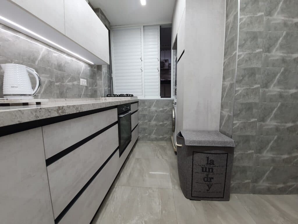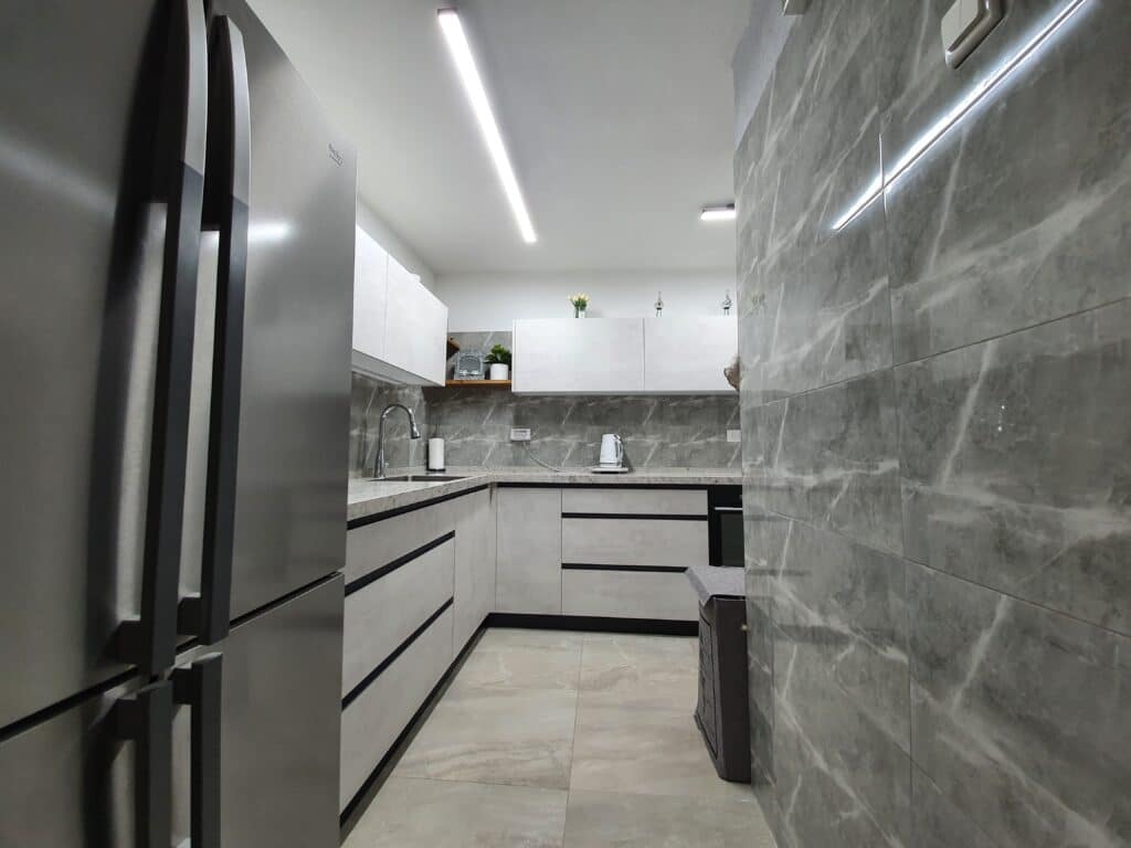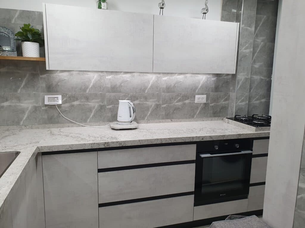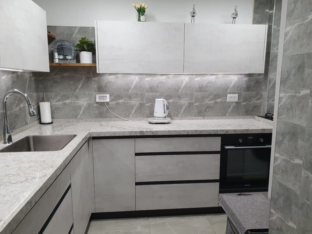מטבח מודרני פורמייקה סטון בשילוב ידיות אינטגרליות צבועות לגוון