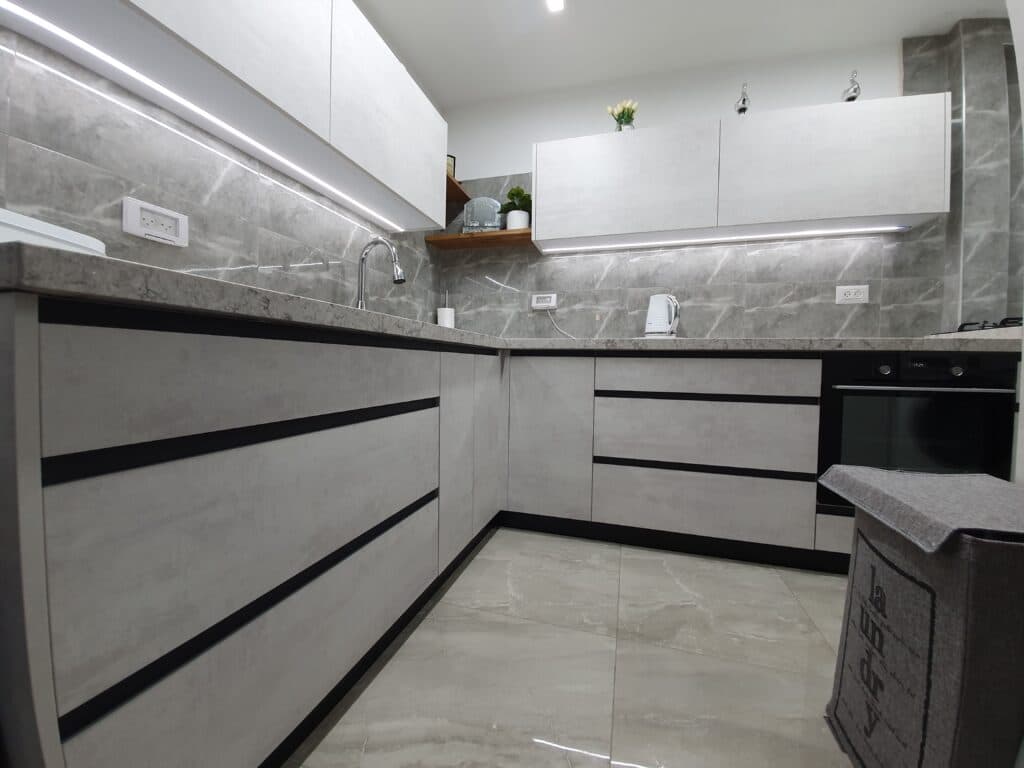 החזיתות שנבחרו מקולקציית סטון של חברת בלורן בשילוב ידיות אינטגרליות צבועות לגוון שחור.